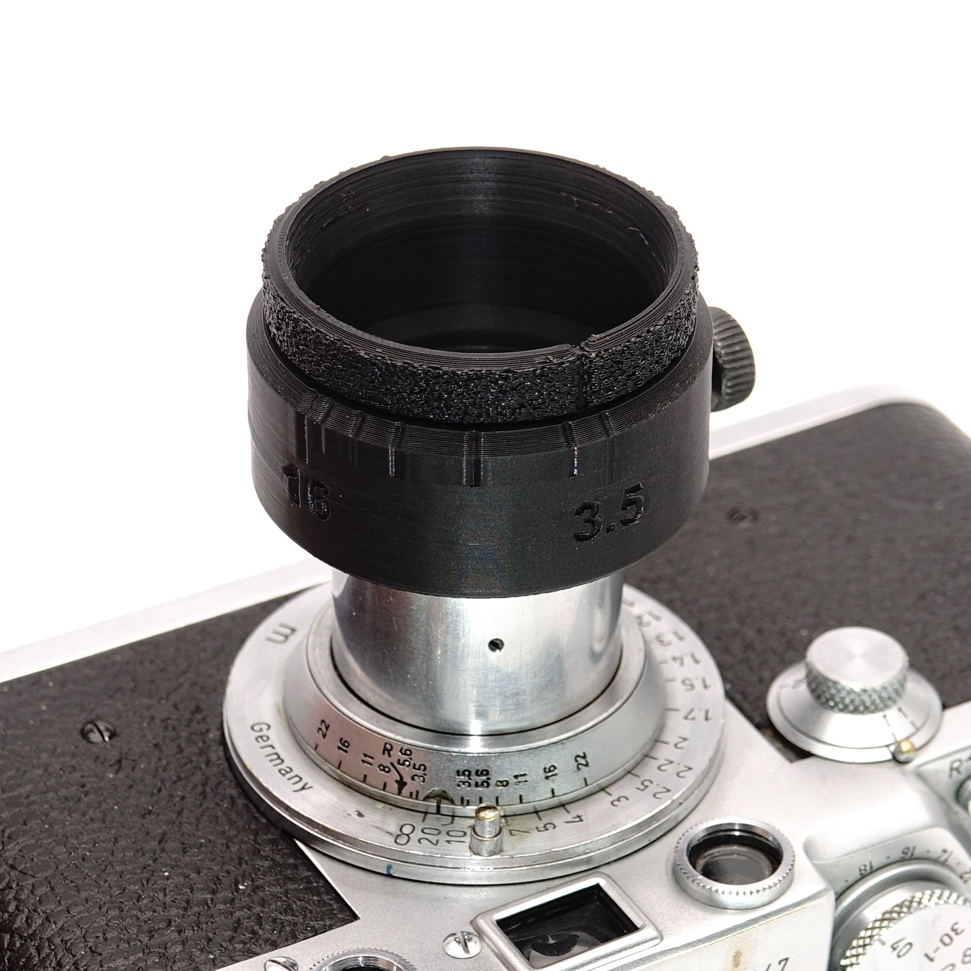 Le Elmar 5cm f/3.5 est un classique, mais le réglage de l'ouverture directement sur la lentille frontale est délicat. Cette réplique parfaitement adaptée du rare pare-soleil VALOO résout le problème : un mécanisme interne s'accouple au levier d'ouverture, te permettant de régler l'ouverture confortablement sur la bague extérieure. La valeur d'ouverture peut être lue à travers une fenêtre à l'intérieur. En même temps, ton objectif bénéficie d'une excellente protection contre la lumière parasite. Fabriqué en PLA+ robuste, c'est une amélioration utile pour une utilisation quotidienne.