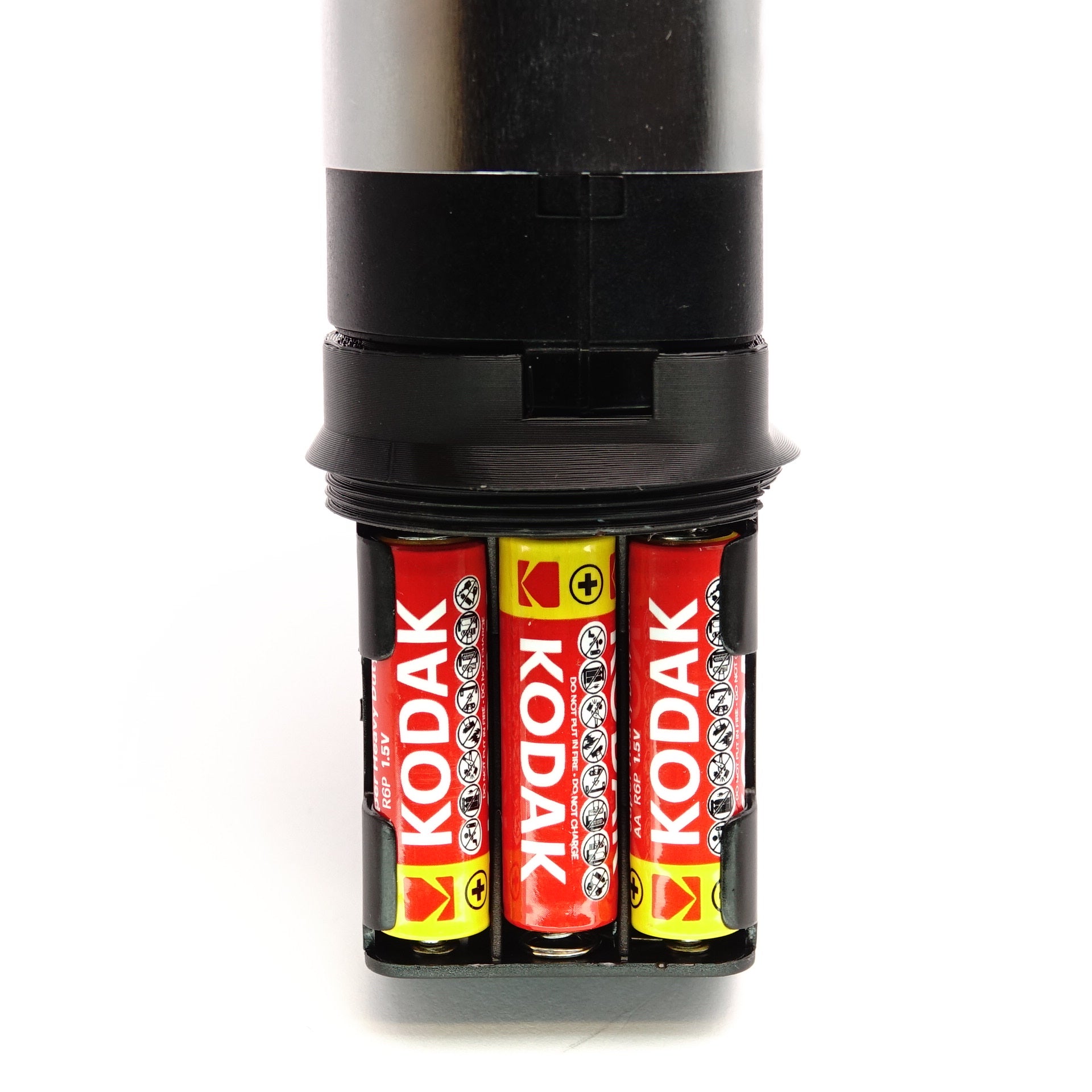This battery holder is made as a sturdy replacement for the original Metz 45-39 holder. It is made of technical plastic (PLA+) and provides a stable housing for 6 AA cells. The base can be unscrewed to quickly change the batteries.