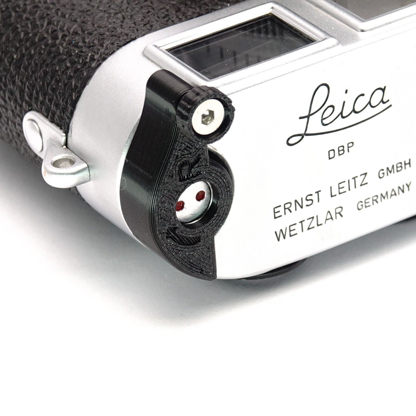 Note: Please check beforehand whether there is a minimal gap between the rewind button and the top cover of your camera. This space can vary with Leica bodies and is necessary for the free movement of the lever.